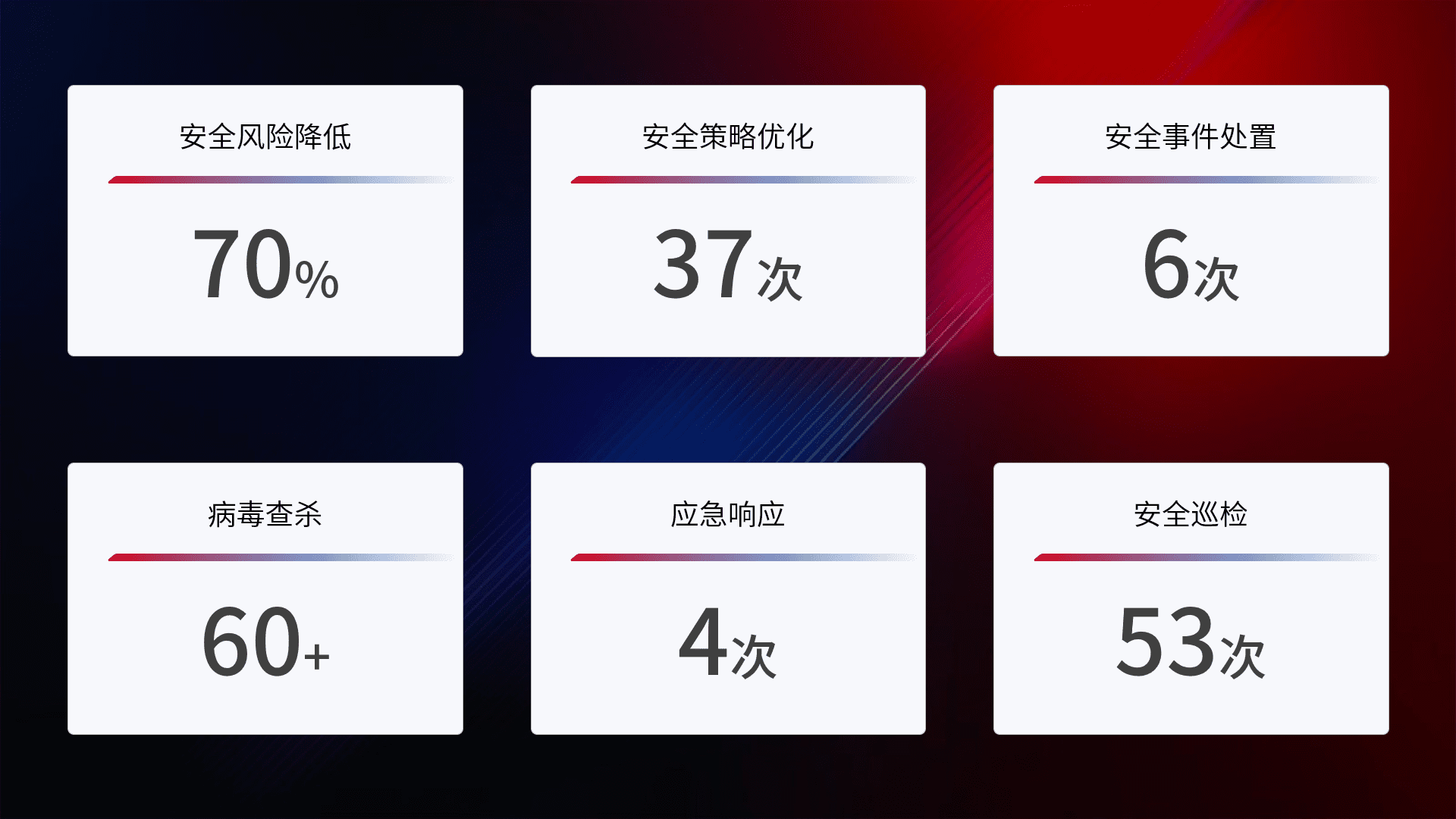 提供全面的安全事件报告体系,,,包括处置报告、、、、周报、、、季度和年度总结,,,,结合持续监控,,,,帮助客户深入了解网络安全状况。。。。